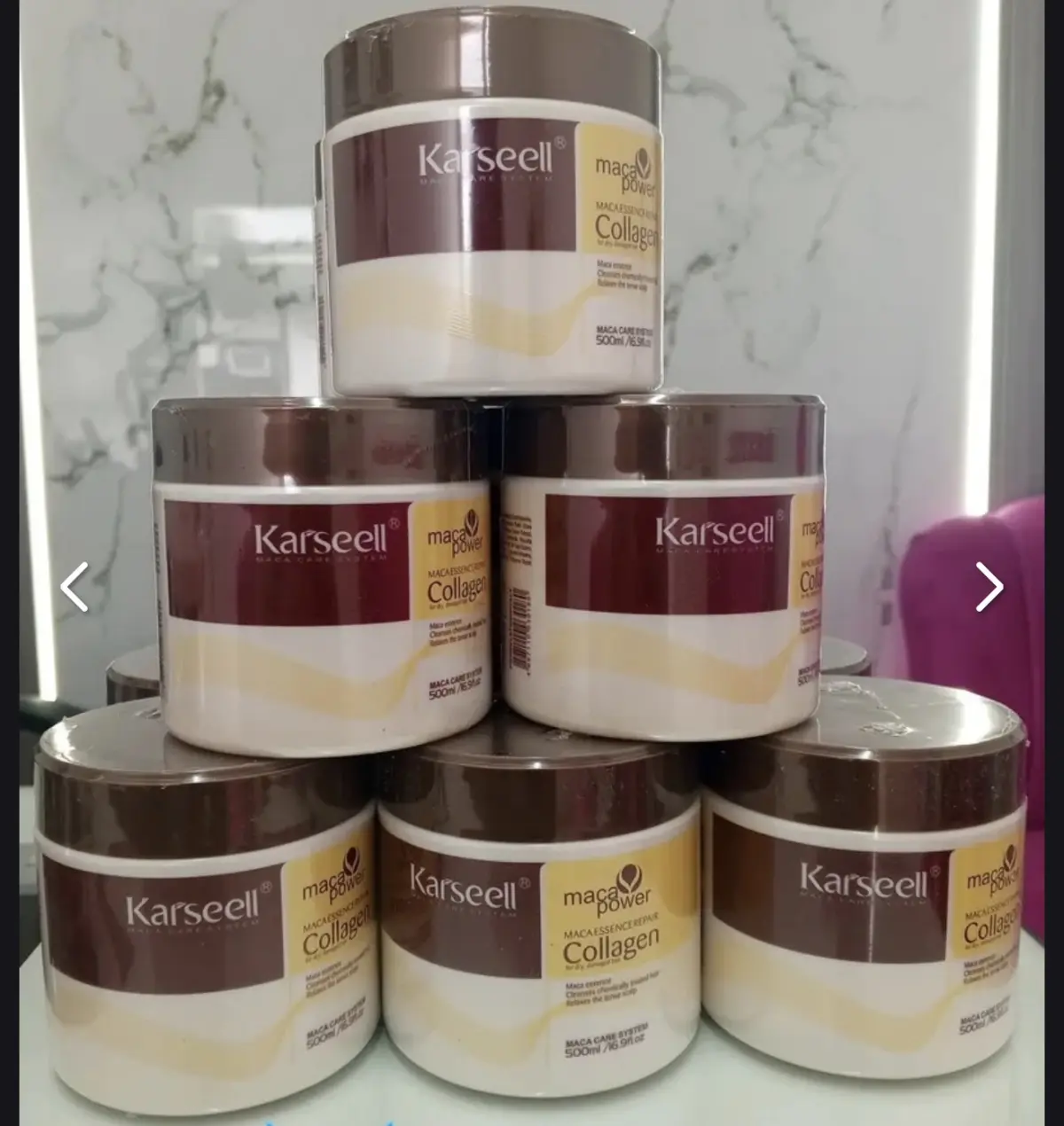 La máscara más buscada y viral del momento: Karseell Collagen 500ml. 100% ORIGINAL, sellada, con lote y fecha de vencimiento impresos, QR de autenticidad que dirige a la web oficial, y etiqueta de alta calidad que no se despega.